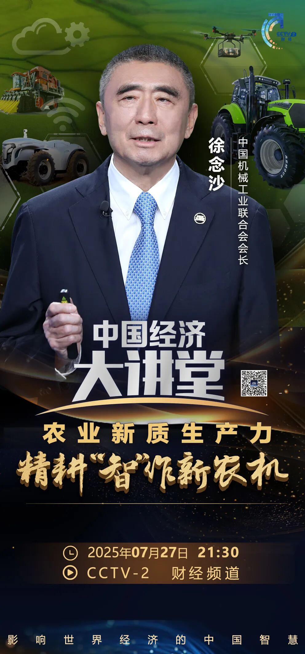 7月27日晚21:30,徐念沙会长将做客CCTV2财经频道《中国经济大讲堂》栏目,为您开讲《农业新质生产力——精耕“智”作新农机》,欢迎收看!